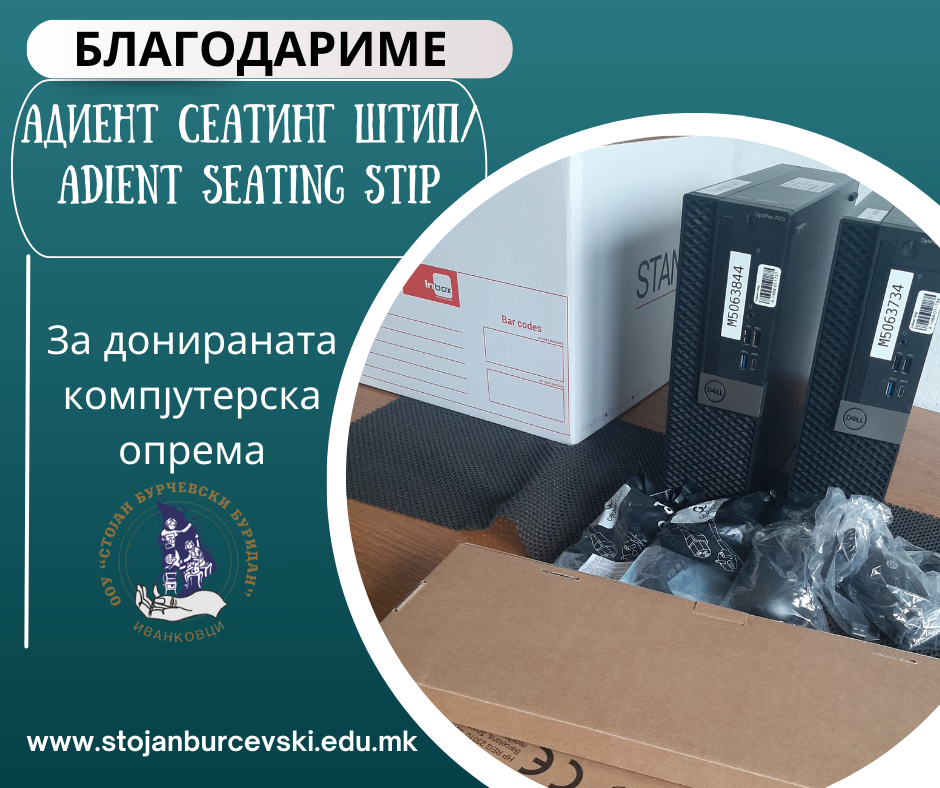 Искрена почит и голема благодарност на АДИЕНТ СЕАТИН ШТИП за нивната несебична донација на компјутери. Оваа поддршка претставува значаен придонес за нашата работа и ќе овозможи подобри услови во наставата, пристап до современи технологии и развој на дигитални и технички вештини. Вашата донација не е само материјална помош – таа е инвестиција во иднината.