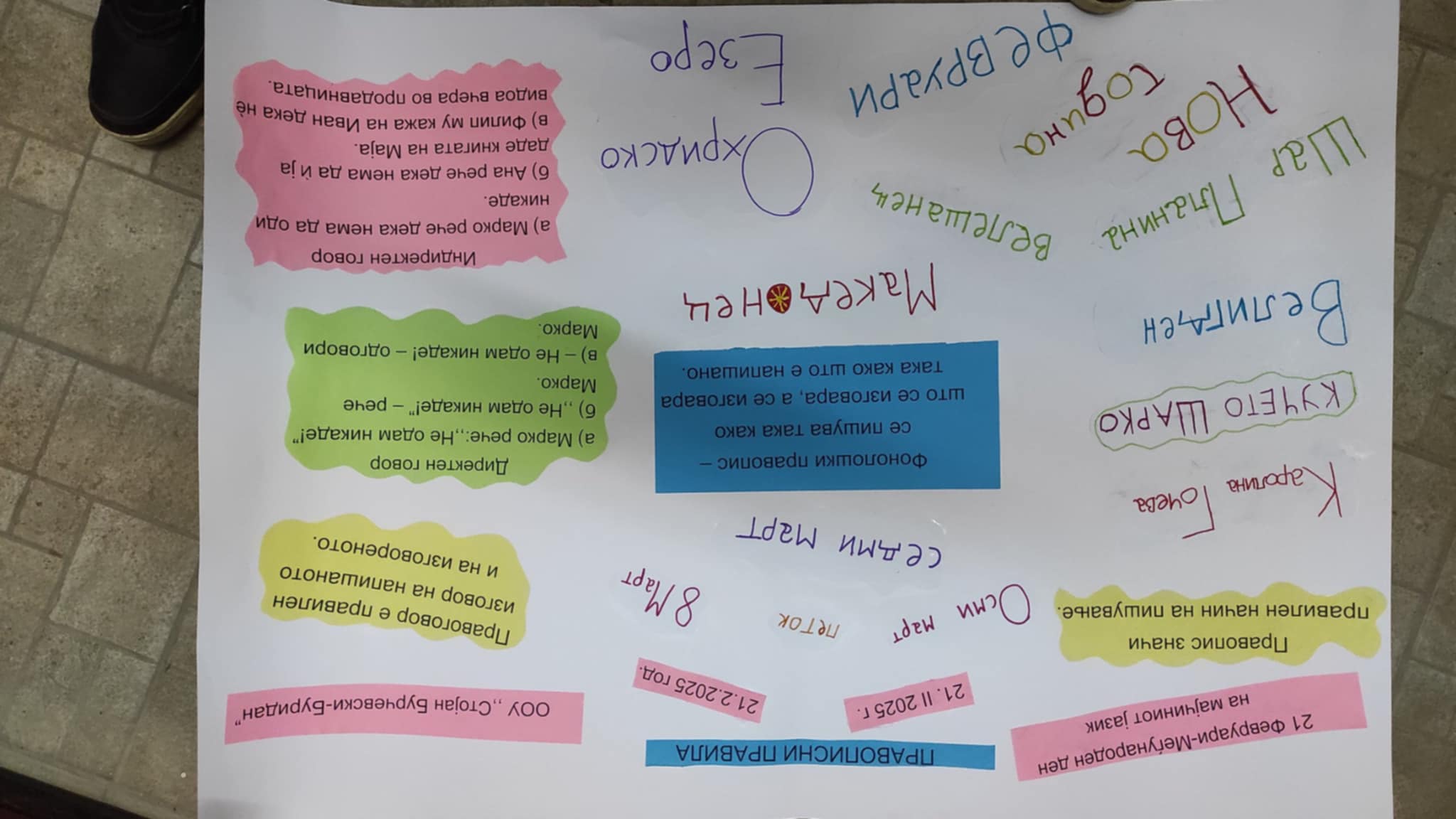 По повод 21 Февруари – Меѓународниот ден на мајчиниот јазик, учениците од предметна настава, имаа предавање од страна на нивниот одговорен наставник, Мирјана Пановска. Потоа, дел од учениците активно се вклучија во креативната работилница, изработувајќи постер плакат за правописни правила. Дел од нив, се натпреваруваа, одговарајќи прашања од интересниот квиз, поврзани со примената на правописните правила. Активностите беа спроведени со цел да внимаваме на правилната употреба на македонскиот стандарден јазик, кој е непресушен, вечен извор и кој треба да го чуваме ,,како тланикот на огништето”.