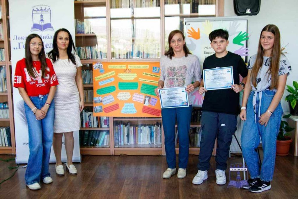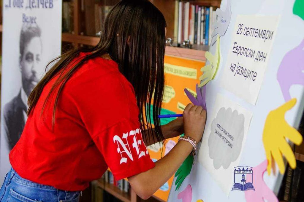 По повод Европскиот ден на јазиците, Локалната библиотека „Гоце Делчев“ од Велес, организираше настан, на кој учествуваа и ученици од нашето училиште, кои настапија со свои активности, промовирајќи ги јазиците, кои ги изучуваат на училиште. На крај, сите ученици, од сите основни и средни училишта во градот, заедно, изработија постер, на кој зборот ,,мир”, го запишаа на неколку европски јазици и сите заедно ја испратија пораката да се изучуваат странски јазици, затоа што КОЛКУ ЈАЗИЦИ ЗНАЕШ, ЗА ТОЛКУ ЛУЃЕ ВРЕДИШ!