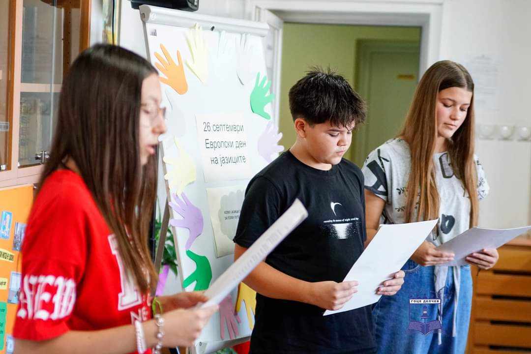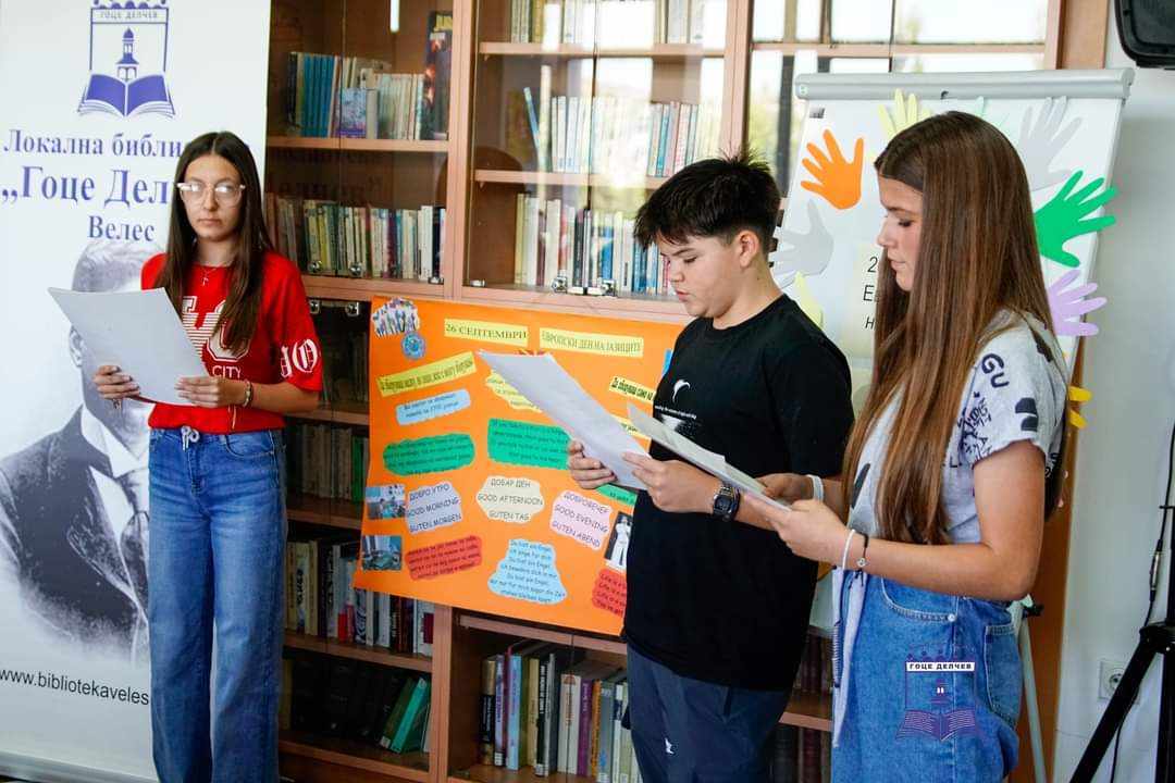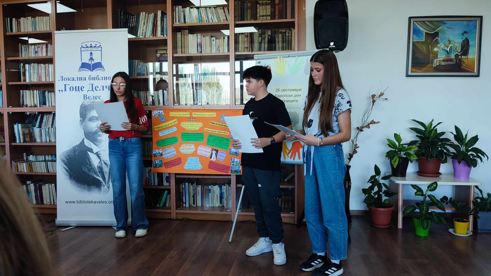 По повод Европскиот ден на јазиците, Локалната библиотека „Гоце Делчев“ од Велес, организираше настан, на кој учествуваа и ученици од нашето училиште, кои настапија со свои активности, промовирајќи ги јазиците, кои ги изучуваат на училиште. На крај, сите ученици, од сите основни и средни училишта во градот, заедно, изработија постер, на кој зборот ,,мир”, го запишаа на неколку европски јазици и сите заедно ја испратија пораката да се изучуваат странски јазици, затоа што КОЛКУ ЈАЗИЦИ ЗНАЕШ, ЗА ТОЛКУ ЛУЃЕ ВРЕДИШ!