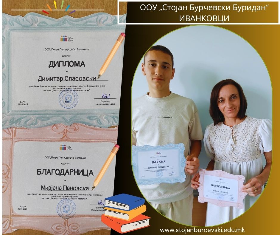 На литературниот конкурс, на тема: „Делата, огледало на нашите постапки“, распишан од ООУ „Петре Поп Арсов“ Богомила, ученикот Димитар Спасовски од деветто одделение освои ПРВО место, под менторство на наставничкта Мирјана Пановска. Честитки до ученикот и до наставничката!
