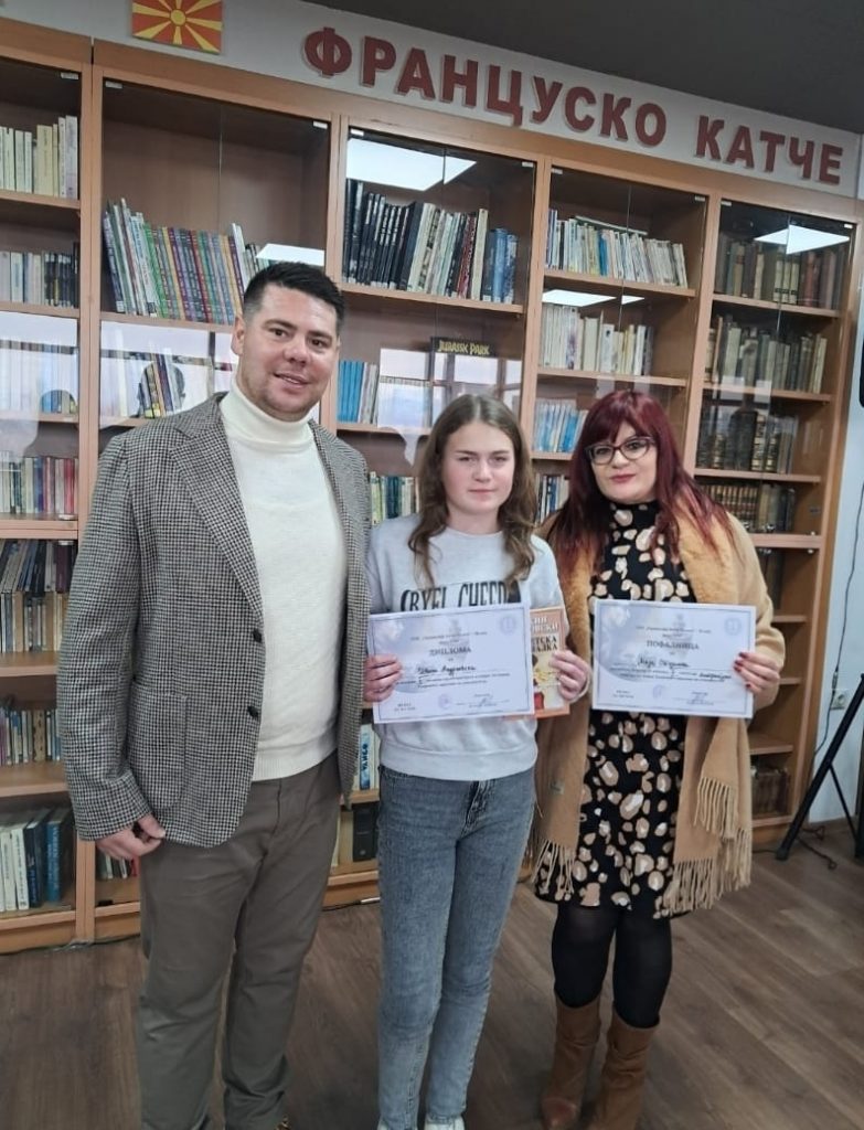 На распишаниот литературен конкурс на тема: „Куќа цел свет братски ми е, братски срце што отвора“ по повод Патрониот празник на СОУ „Гимназија Кочо Рацин“ , нашата ученичка Ивона Андреевска од 9 одделение се стекна со ДИПЛОМА ЗА ОСВОЕНА ВТОРА НАГРАДА