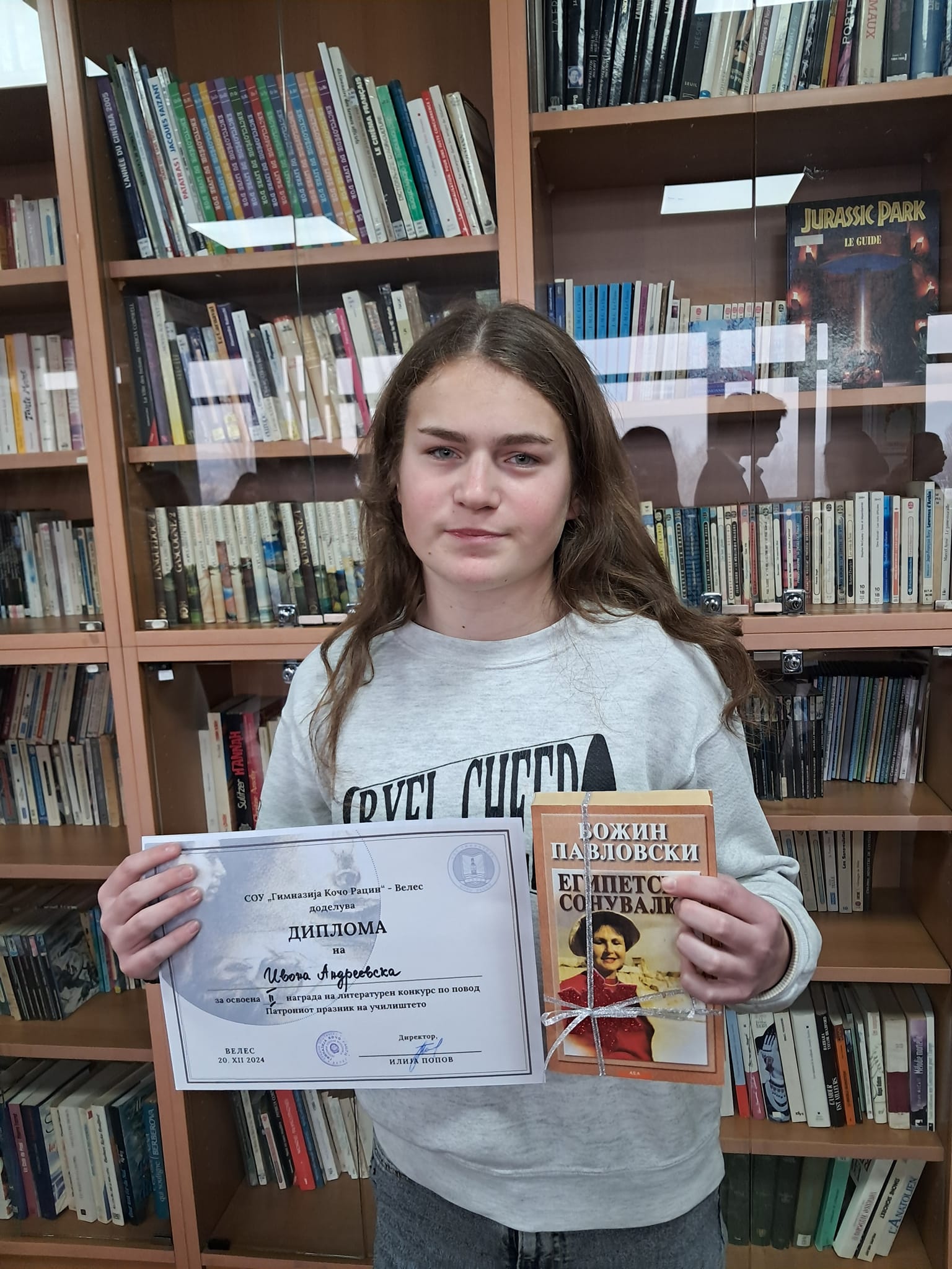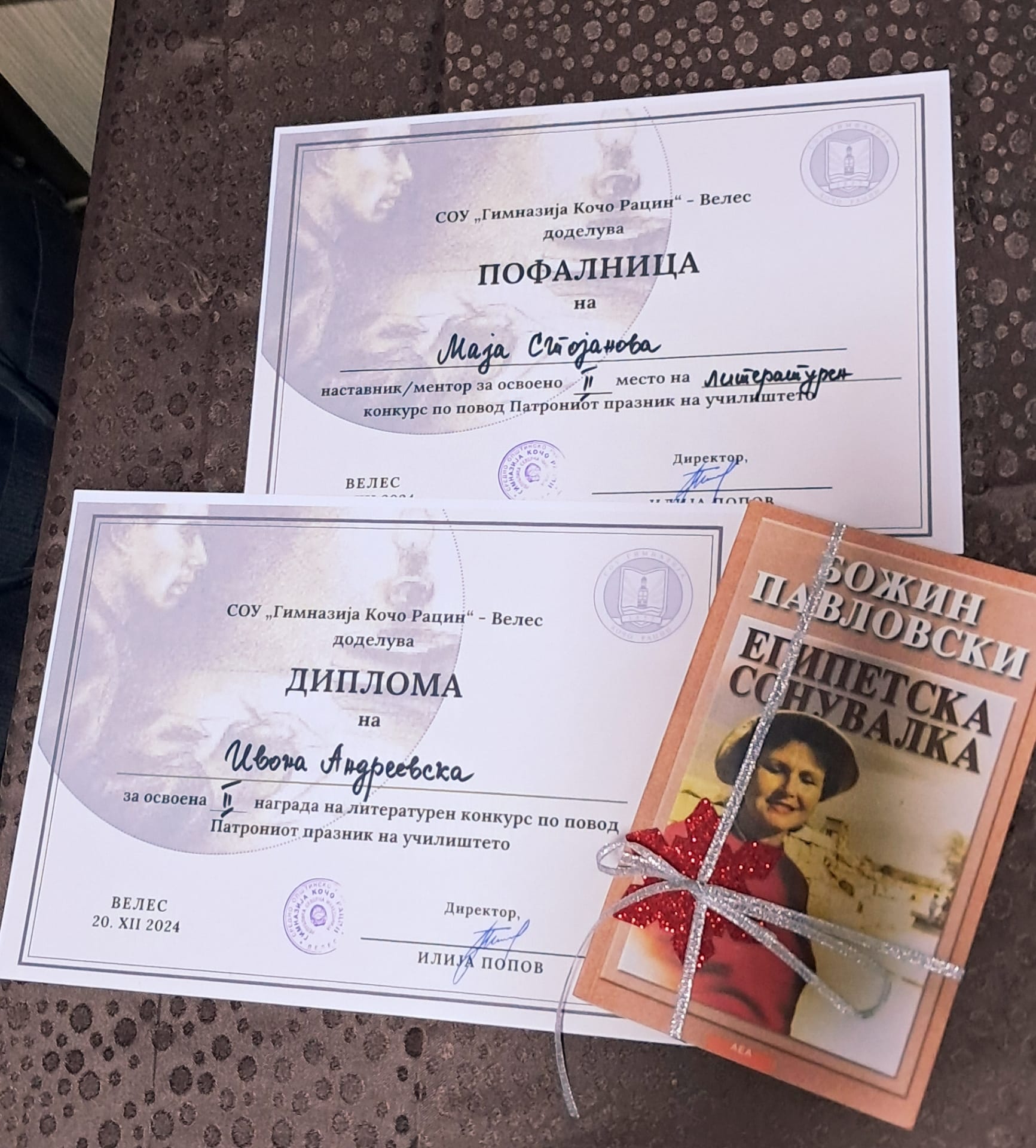 На распишаниот литературен конкурс на тема: „Куќа цел свет братски ми е, братски срце што отвора“ по повод Патрониот празник на СОУ „Гимназија Кочо Рацин“ , нашата ученичка Ивона Андреевска од 9 одделение се стекна со ДИПЛОМА ЗА ОСВОЕНА ВТОРА НАГРАДА