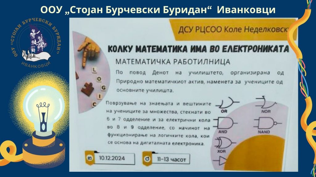 Ученици од нашето училиште, со наставничката Андријана Кариланова зедоа учество во Математичката работилница „КОЛКУ МАТЕМАТИКА ИМА ВО ЕЛЕКТРОНИКАТА„ организирана од Природно математичкиот актив, по повод Патрониот празник на ДСУ РЦСО „Коле Неделковски“