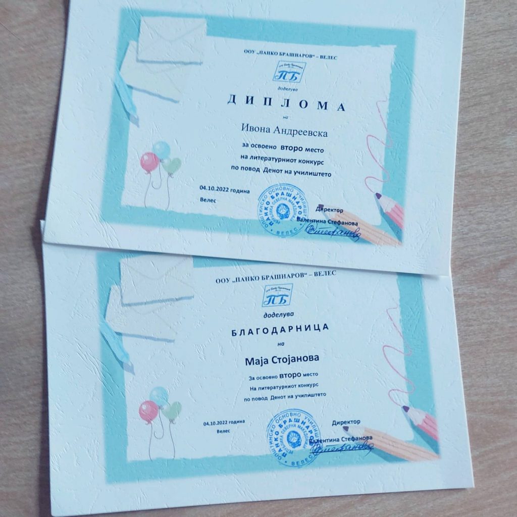 6.10.2022 На распишаниот литературен конкурс на тема: ,,Училиштето н’и ги отвора портите на знаењето и нè прави подобри луѓе,, по повод Денот на ООУ ,,Панко Брашнаров,, -Велес, ученичката Ивона Андреевска од седмо одделение освои ВТОРО МЕСТО под менторство на наставничката по македонски јазик Маја Стојанова. Честитки Ивона, нека следат уште многу успеси во иднина