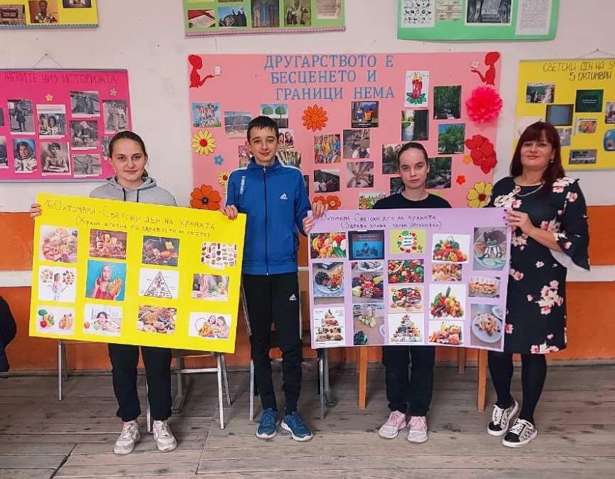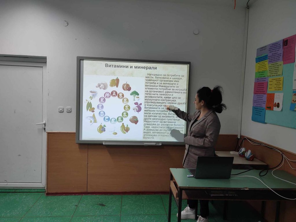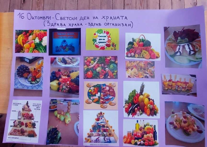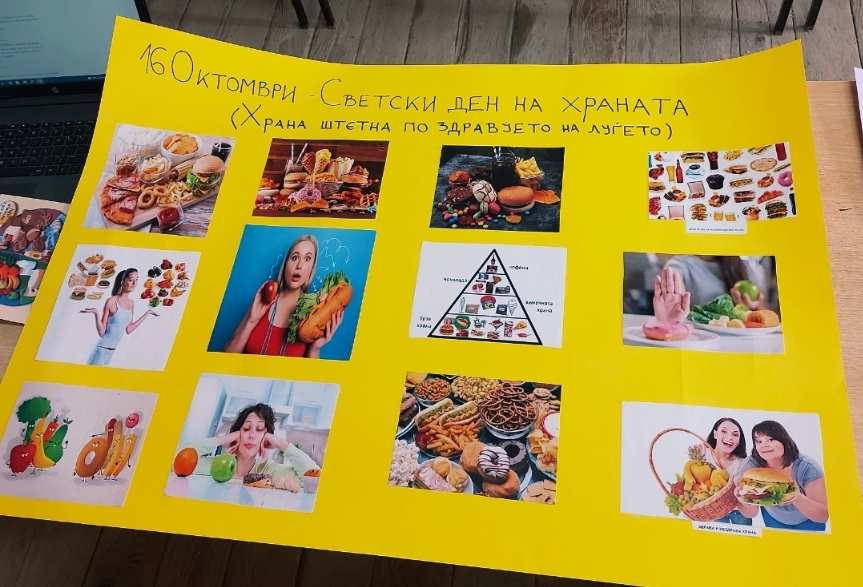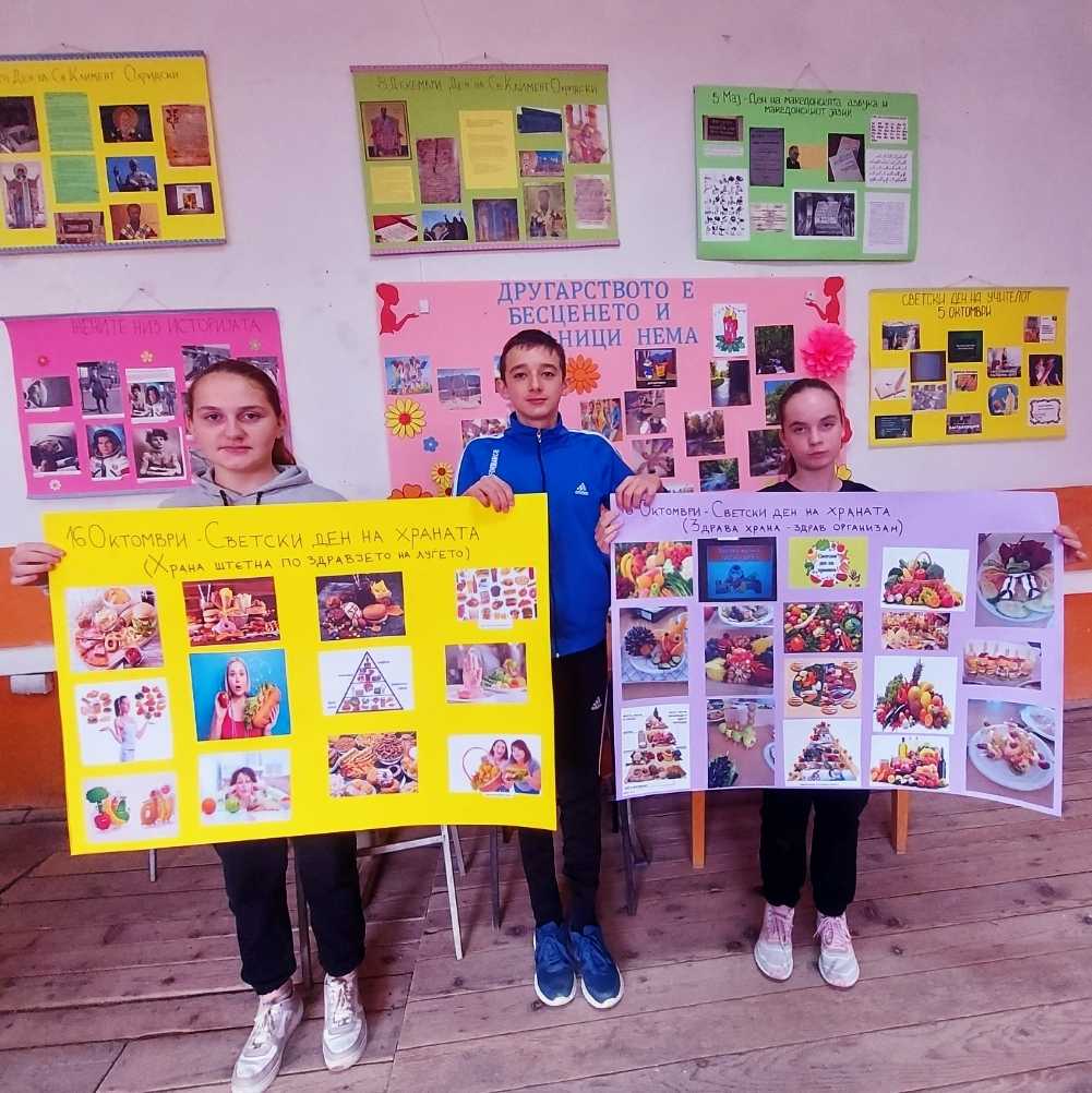 По повод Светскиот ден на храната, под мото „Водата е живот, водата е храна“, учениците од седмо одделение имаа предавање, кое го организираше наставничката по Биологија, Андријана Сарагиновска. Учениците, преку презентација, се стекнаа со бројни информации за здравата храна, богата со витамини, протеини и минерали и за значењето на водата. Активноста ја продолжија со декорација на зеленчук и овошје и работилница „Здрава наспроти нездрава храна“со помош на наставничките по Вештини на живеење, Мирјана Пановска и Маја Стојанова. На крај, зеленчукот и овошјето го поделија со сите ученици, со цел да се прошири идејата за здрав начин на исхрана.