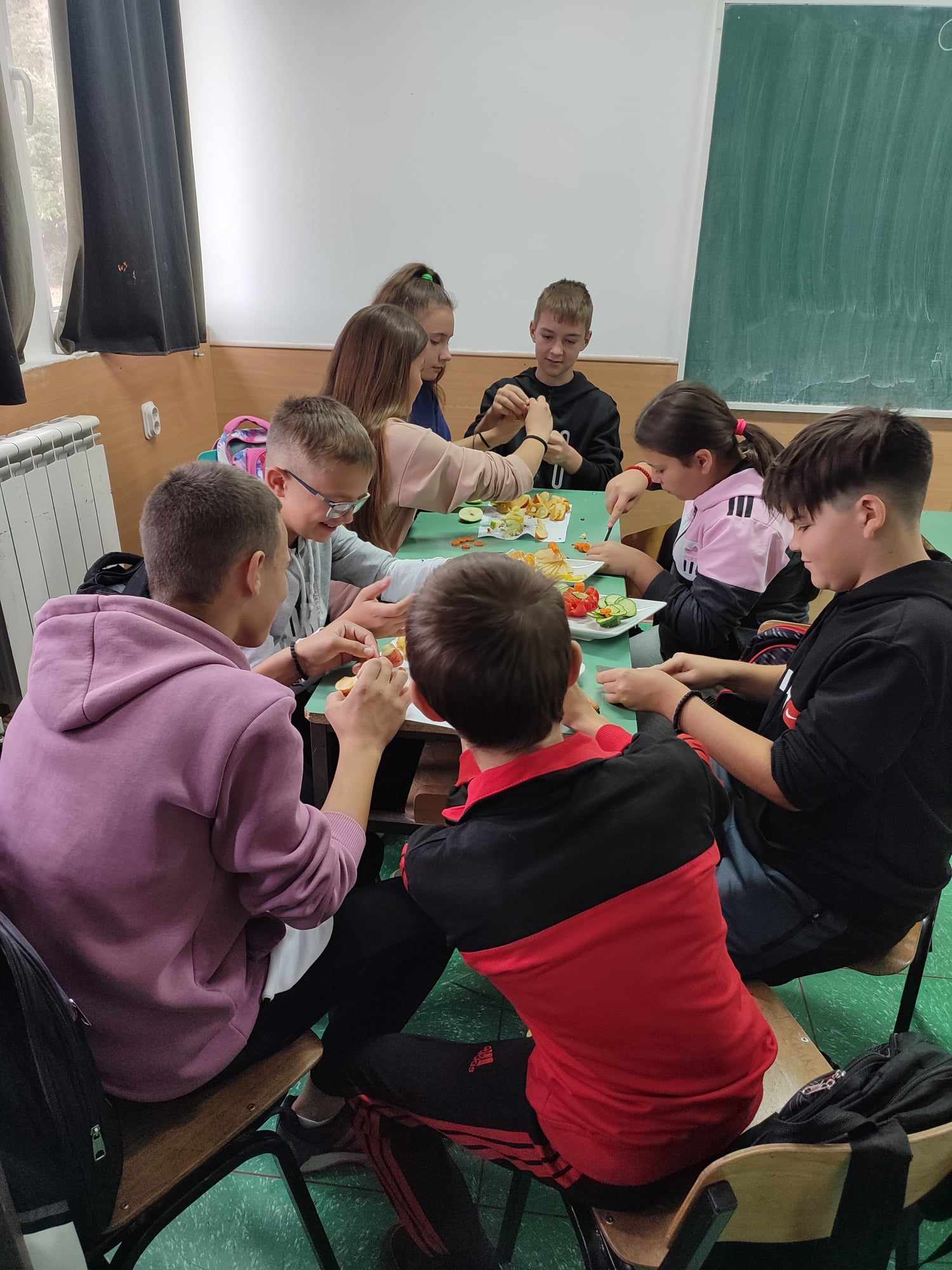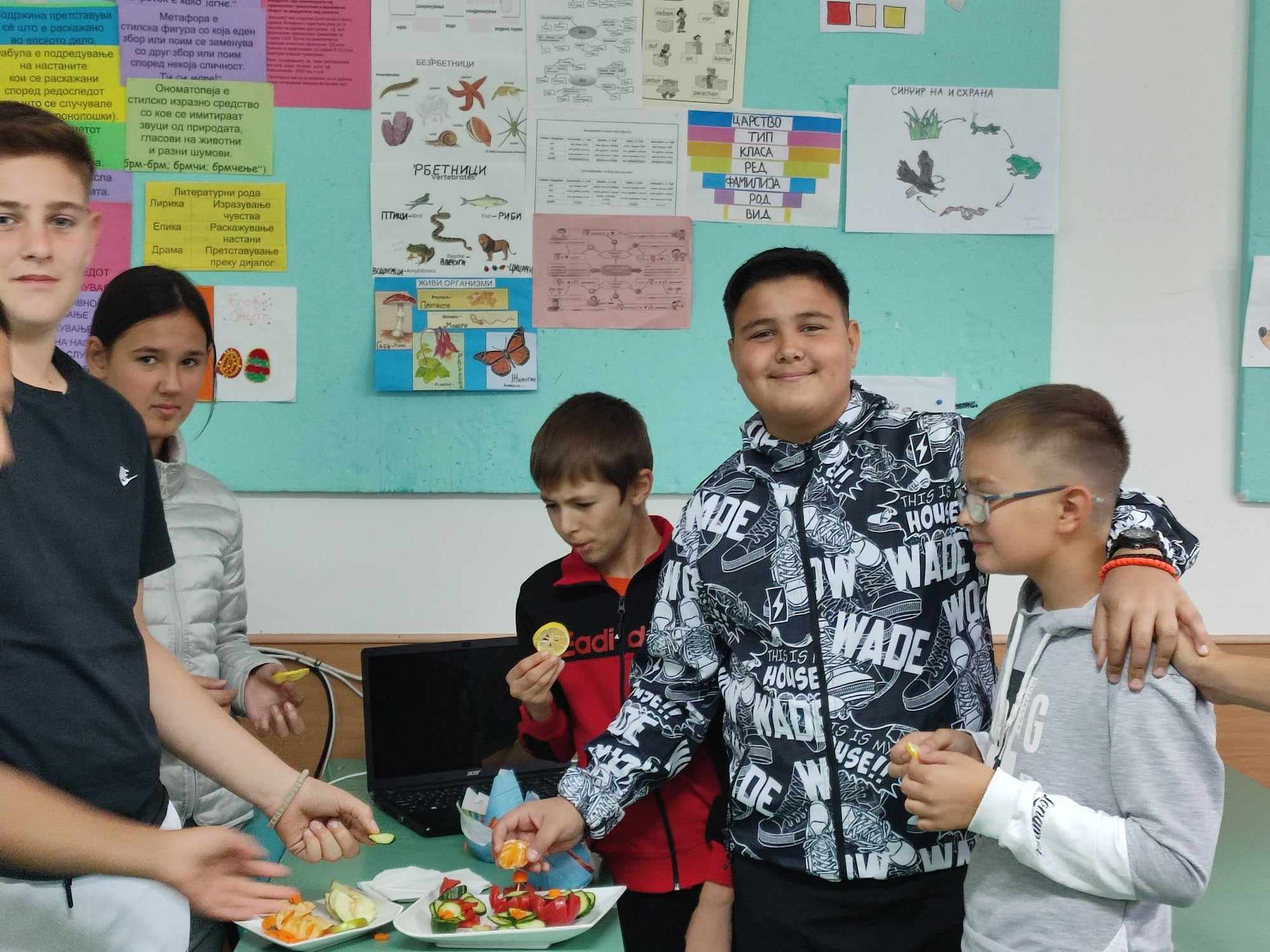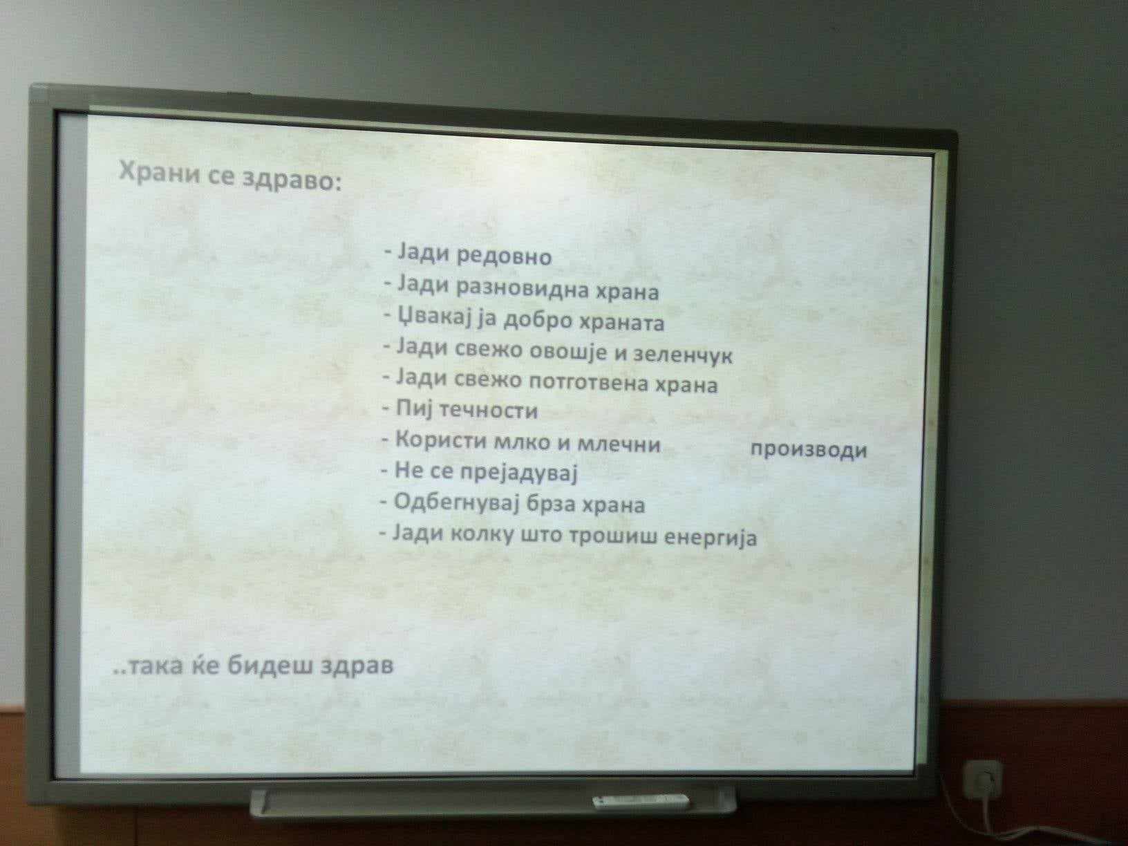 По повод Светскиот ден на храната, под мото „Водата е живот, водата е храна“, учениците од седмо одделение имаа предавање, кое го организираше наставничката по Биологија, Андријана Сарагиновска. Учениците, преку презентација, се стекнаа со бројни информации за здравата храна, богата со витамини, протеини и минерали и за значењето на водата. Активноста ја продолжија со декорација на зеленчук и овошје и работилница „Здрава наспроти нездрава храна“со помош на наставничките по Вештини на живеење, Мирјана Пановска и Маја Стојанова. На крај, зеленчукот и овошјето го поделија со сите ученици, со цел да се прошири идејата за здрав начин на исхрана.