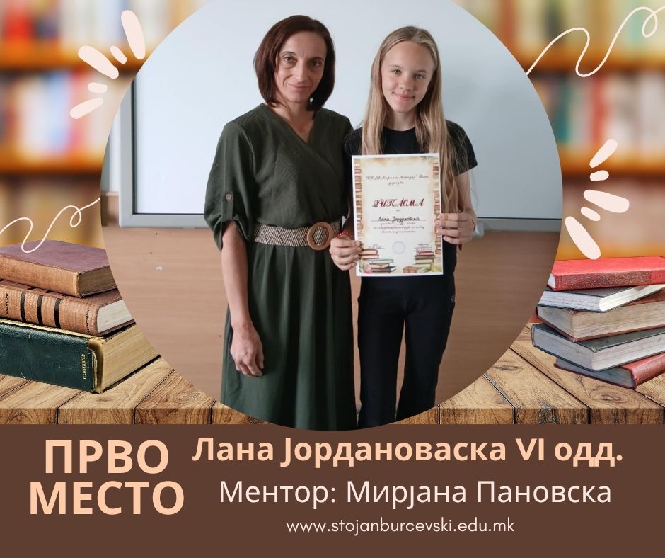 На распишаниот литературен конкурс од ООУ „Св. Кирил и Методиј“-Велес, по повод Денот на училиштето на тема: „Јазикот е нашата татковина“ ученичката Лана Јордановска од шесто одделение го освои ПРВОТО место, под менторство на наставничката Мирјана Пановска. Им честитаме и им посакуваме уште многу награди!