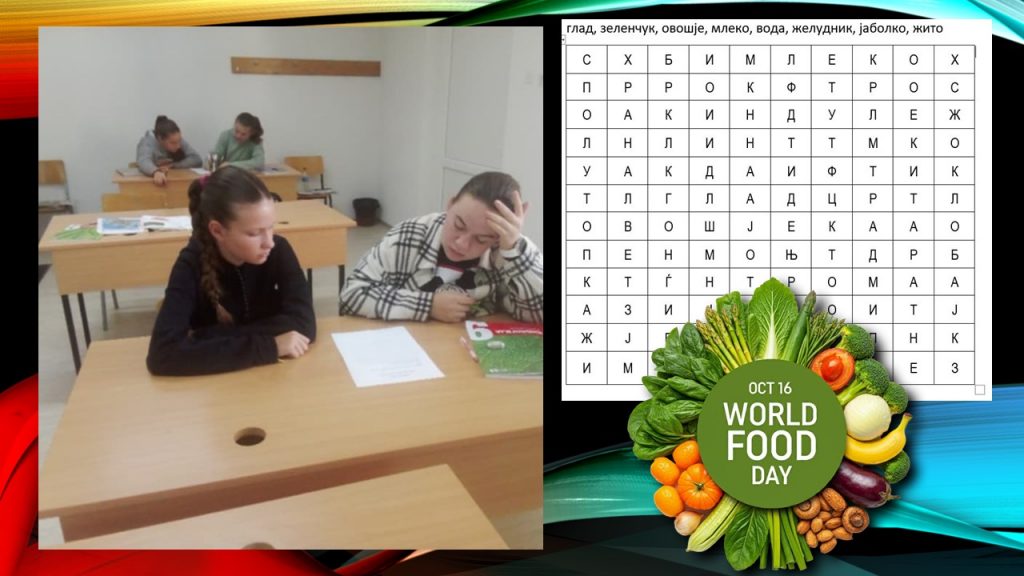 Денес во нашето училиште под мотото „Право на храна за подобар живот и подобра иднина: Никој да не биде изоставен“, се одбележа Светскиот ден на храната. Учениците преку презентација се запознаа со целта на овој ден: промовирање на глобалната свест и акција за оние кои страдаат од глад и потребата за обезбедување здрава исхрана за сите. Како активност учениците решаваа осумнасочник изготвен од наставничката Андријана Сарагиновска.